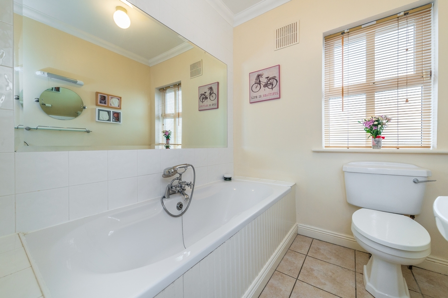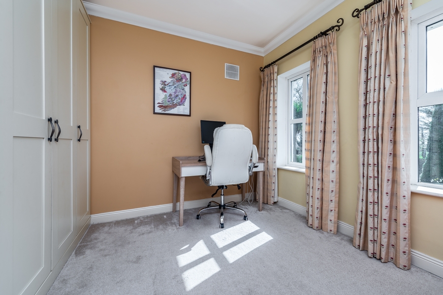 The property is surrounded by beautifully maintained gardens to both the front and rear, predominantly laid in lawn and bordered by mature hedging and trees, ensuring complete privacy. A feature patio area, accessed directly from the dining room, provides the perfect setting for outdoor dining and entertaining.