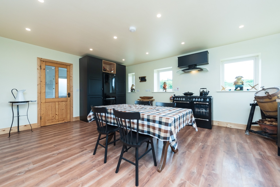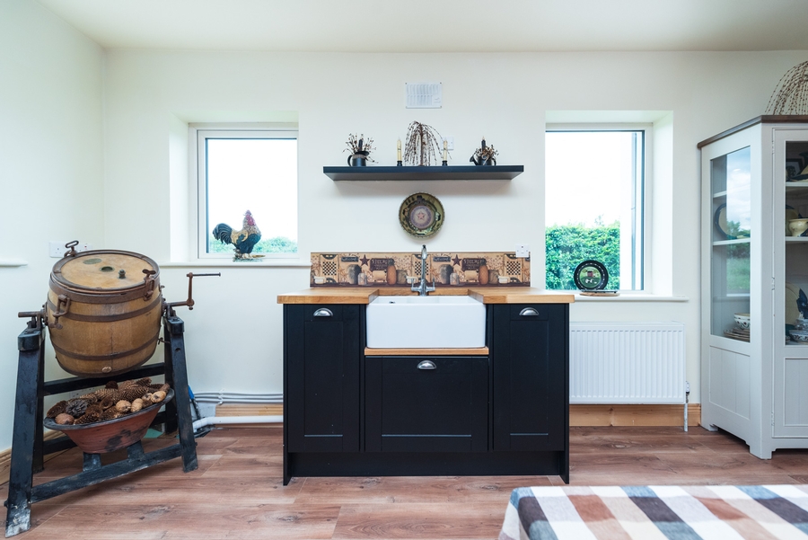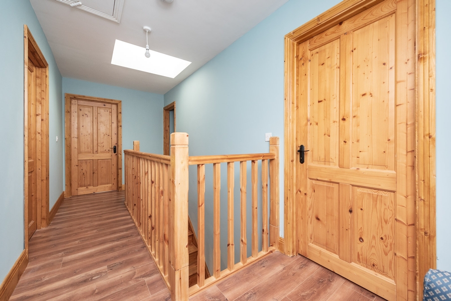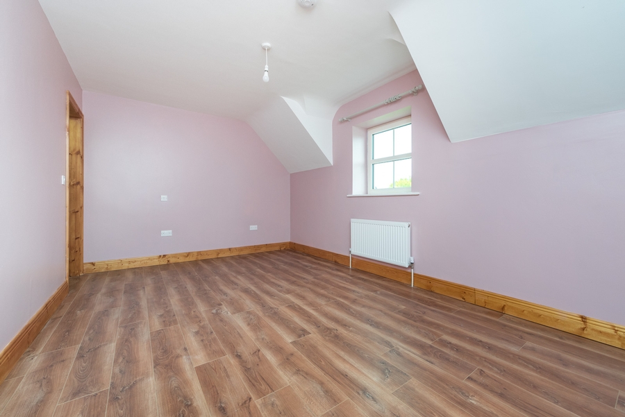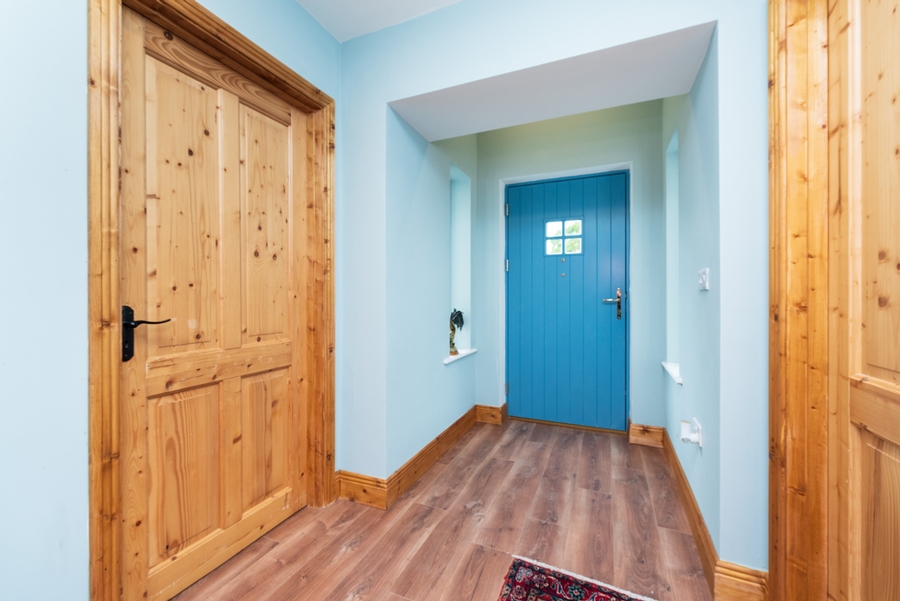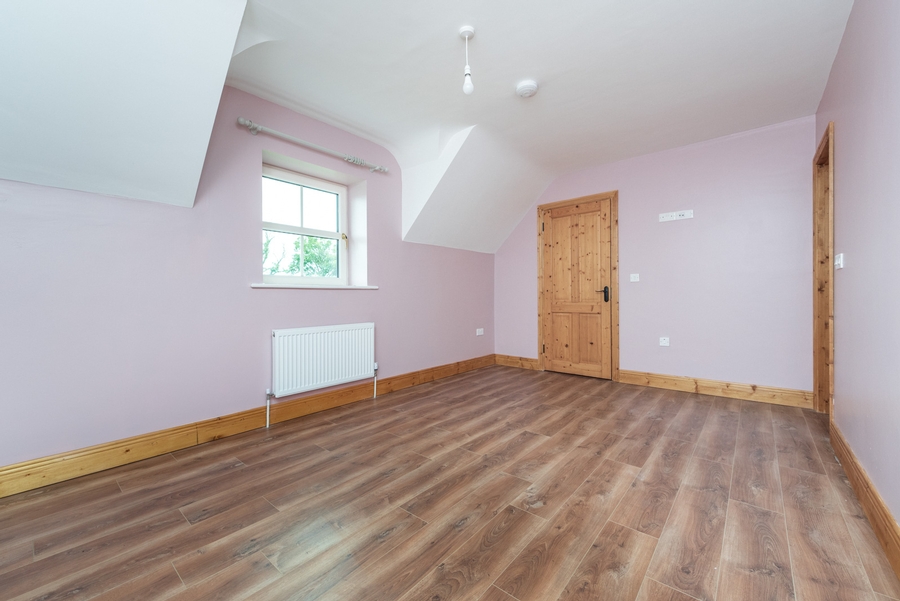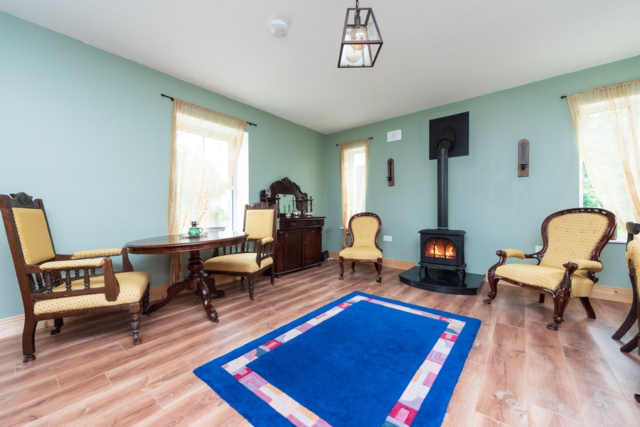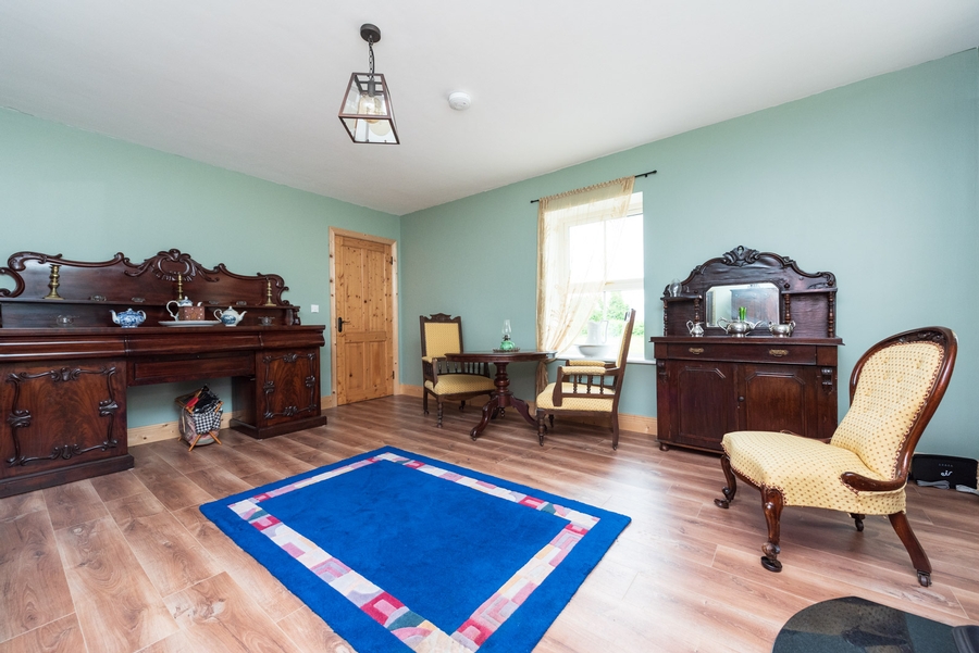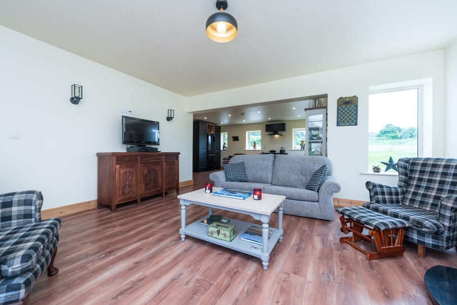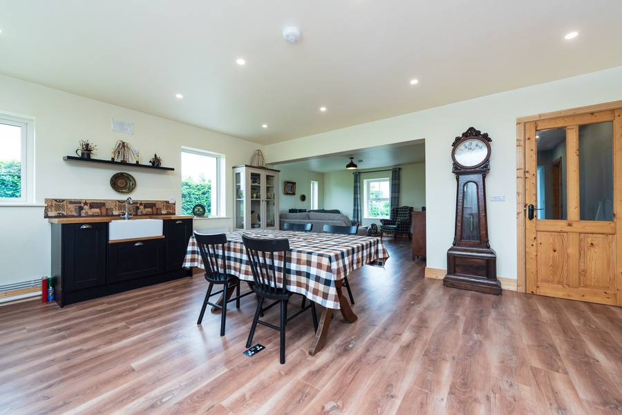 On entering the property, you are greeted by an inviting hallway with wood flooring, featured staircase with ample storage underneath. On your left is the family room which is generous in size with a woodburning stove. Across the hall is the open plan living room & kitchen area, a light filled space which exudes warmth & cosiness. The wood pellet stove providing cost effective heating. The kitchen boasts handmade units and countertop with feature Belfast Sink. Spacious utility room just of kitchen with fitted units/sink. Guest W.C. with tiled flooring & fitted suite. Doorway leading to rear garden.