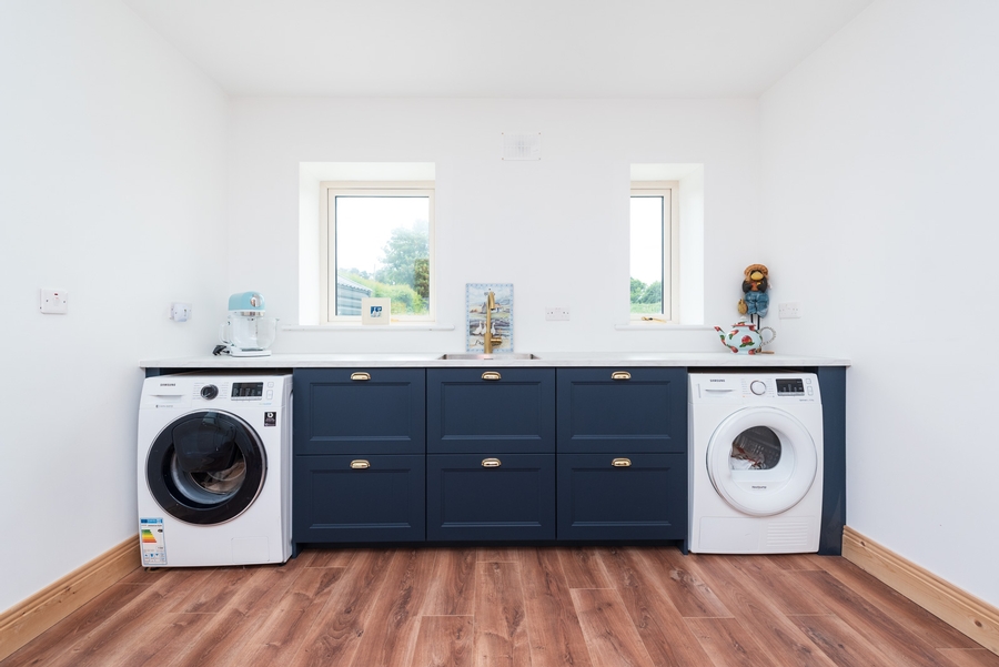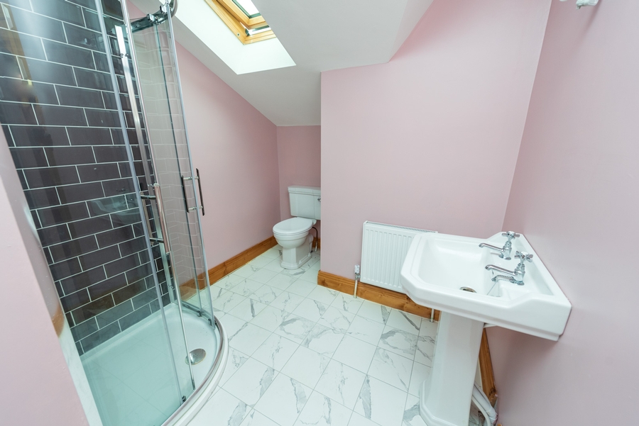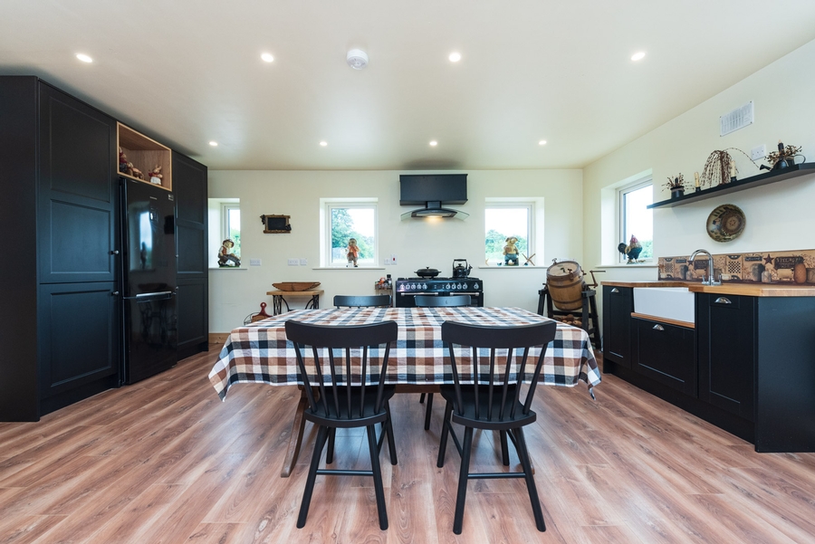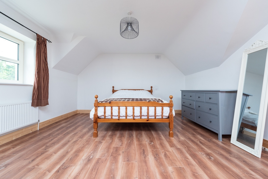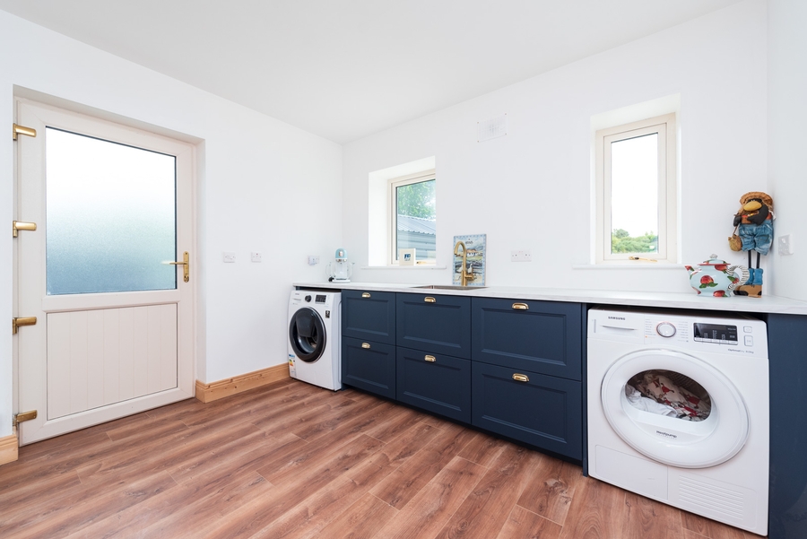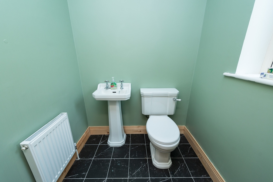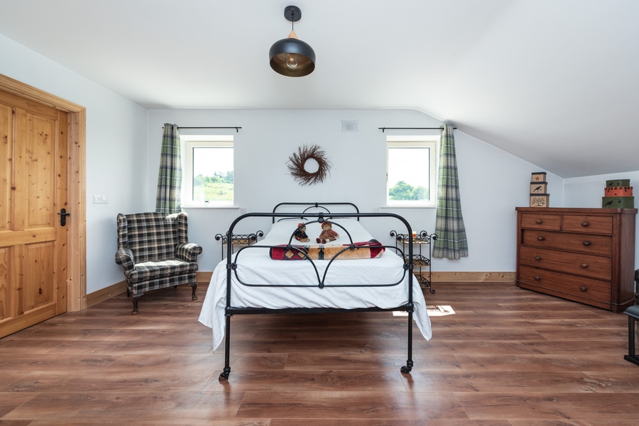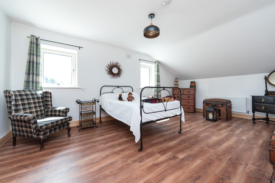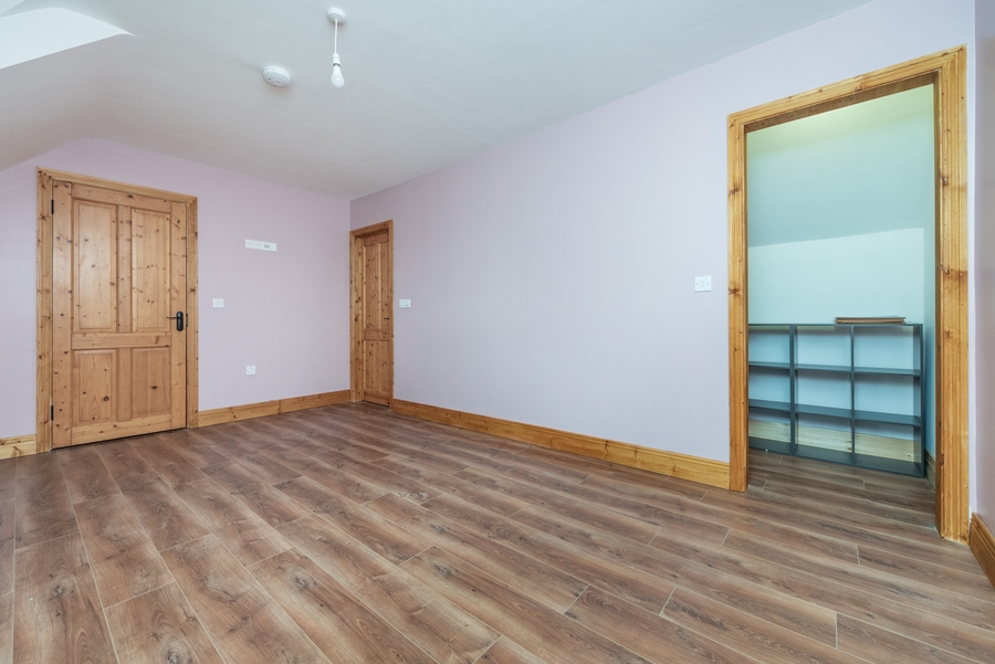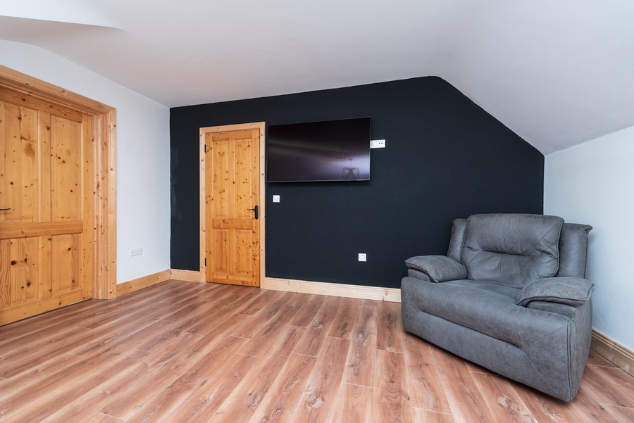 On entering the property, you are greeted by an inviting hallway with wood flooring, featured staircase with ample storage underneath. On your left is the family room which is generous in size with a woodburning stove. Across the hall is the open plan living room & kitchen area, a light filled space which exudes warmth & cosiness. The wood pellet stove providing cost effective heating. The kitchen boasts handmade units and countertop with feature Belfast Sink. Spacious utility room just of kitchen with fitted units/sink. Guest W.C. with tiled flooring & fitted suite. Doorway leading to rear garden.